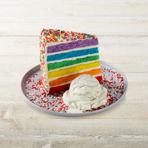 Rainbow Cake is available by the slice or you can opt for the entire cake at participating locations. His award winning designs have been featured in countless bridal and baking magazines. Mixed greens carrots red cabbage avocado tomatoes chopped cage-free egg bacon blue cheese red onions cucumber Jack cheese cheddar Ranch dressing on the side.